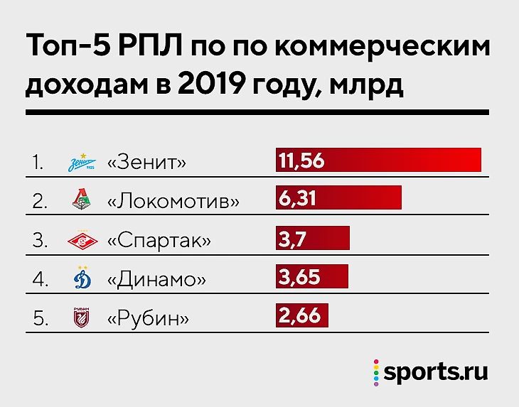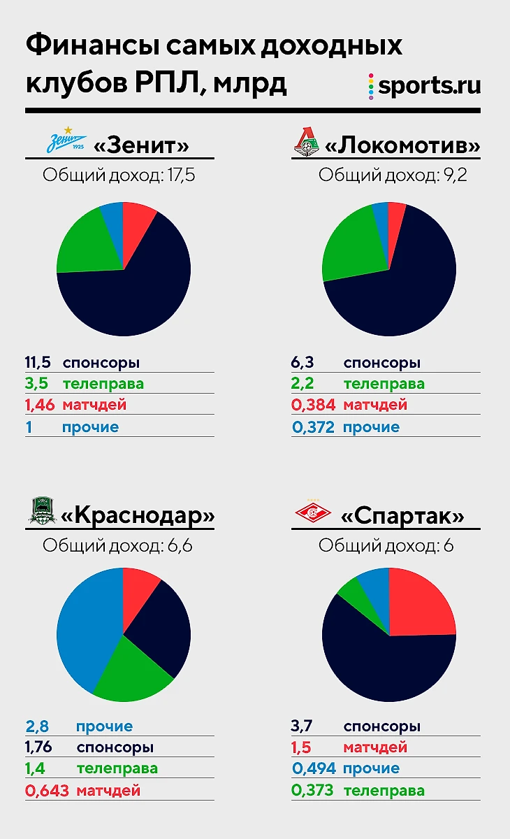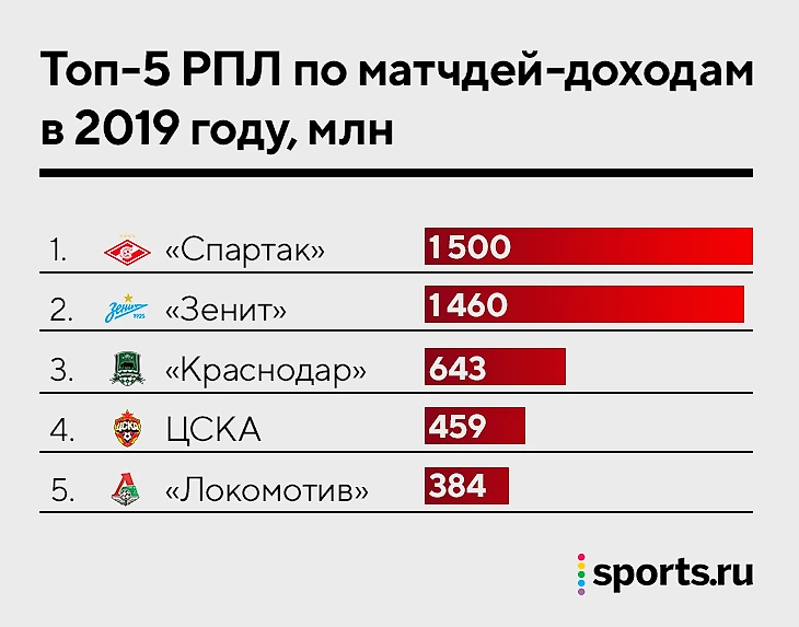 Согласно отчетности РФС (данные предоставляют сами клубы), в 2019 году «Спартак» заработал при проведении матчей 1,5 миллиарда рублей. Это самый высокий показатель в РПЛ, хотя посещаемость у красно-белых была ниже, чем у «Зенита»: 23 тысячи против 35. По расчетам Sports.ru, основанным на статистике прежних сезонов, матчдей-доходы в 2019-м распределились примерно так: