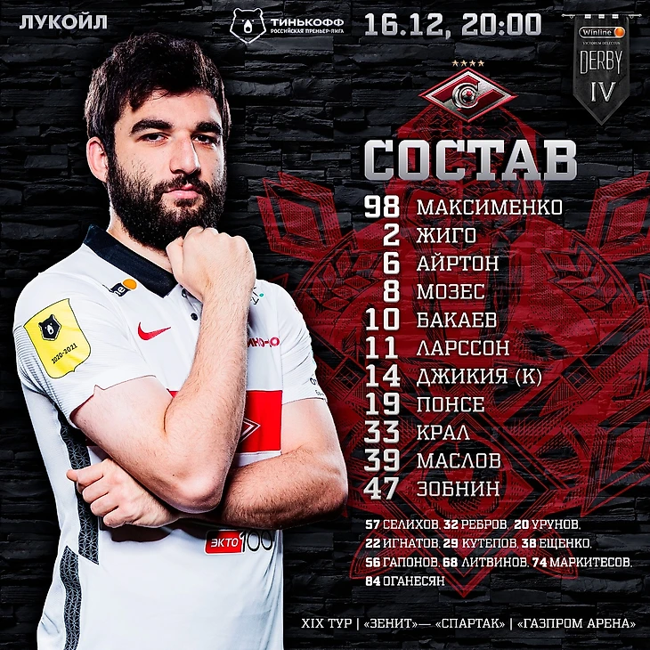 Доменико Тедеско решил выбрать рискованную схему с тремя защитниками - 3-5-2. Ворота Москвичей защищал - Максименко; помогала ему линия защиты, состоящая из Джикии (капитан), Жиго и Маслова; в полузащите играли: Айртон, Крап, Бакаев, Зобнин и Мозес; ну а в нападении сыграли: Понсе и Ларссон.