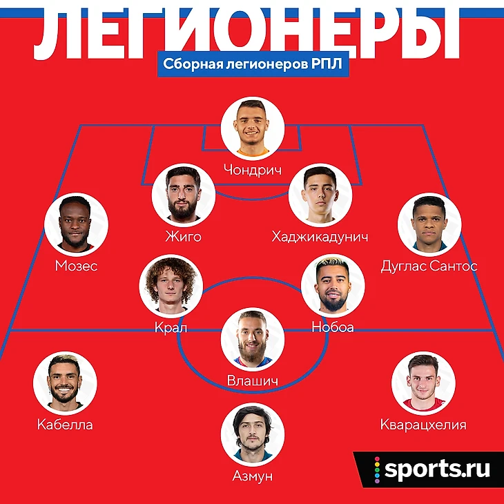 Йосип Чондрич Хорватский голкипер «Ротора» – единственный иностранный вратарь, который играет в РПЛ, поэтому с этой позицией определиться было легко. Виктор Мозес На позиции правого защитника выбор легионеров так же невелик. Эту позицию в символической сборной займет нигериец Виктор Мозес. Самюэль Жиго Сборная легионеров РПЛ не может существовать без одного из самых ярких центральных защитников. Француз Жиго не просто качественный защитник. Он лидер команды и любимец болельщиков «Спартака». Деннис Хаджикадунич Боснийский центральный защитник уже не первый сезон цементирует оборону «Ростова». К футболисту есть интересов из Бундеслиги. Дуглас Сантос На эту позицию выбор был между двумя бразильцами – Сантосом и Айртоном. Но зенитовец чемпион России, обладатель кубка России и один из вице-капитанов команды, поэтому выбор пал в его пользу. Алекс Крал В текущем сезоне чешский полузащитник сыграл во всех матчах «Спартака» в стартовом составе и был заменен лишь однажды. Уже появились слухи об интересе к Кралу из АПЛ. Кристиан Нобоа В свои 35 Нобоа является не только лидером «Сочи», но и одним из лучших бомбардиров лиги. В России Кристиан играет с 2007 года с небольшим перерывом на ПАОК в 2015. Никола Влашич Настоящий лидер ЦСКА и один из лучших игроков чемпионата. Без Влашича символическая сборная легионеров РПЛ не была бы полной. Реми Кабелла Кабелла – один из самых техничных игроков в РПЛ. «Краснодар» с ним и без него – это две разные команды. Хвича Кварацхелия Кварацхелия – самый молодой игрок этой символической сборной. Хвича самый перспективный игрок чемпионата. В свои 19 лет он главный игрок «Рубина». Сердар Азмун Сердар забивает голы, помогает своему клубу выигрывать титулы. Азмун так давно в РПЛ, что некоторые думают, что он игрок сборной России. Скамейка запасных: Айртон, Ловрен, Норманн, Барриос, Вандерсон, Бикфалви, Классон, Ларссон, Понсе, Зе Луиш. Что думаете по этому поводу? Пишите в комментариях свои варианты сборной легионеров РПЛ.