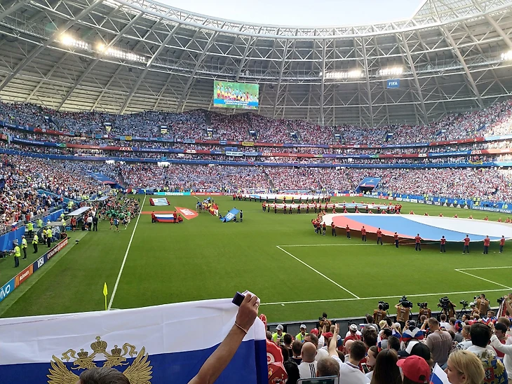 Вместо посещения арабского дерби вылетевших с турнира команд Египта и Саудовской Аравии и наблюдения за белыми одеяниями шейхов, я отправился в Самару поддержать сборную России, поражающую на этом первенстве не только любителей и преданных поклонников, но всех прочих, привыкших к досрочным вылетам сборной России на протяжение последних десяти лет. Изменение планов произошло под влиянием редкостного зрелища в виде бьющейся, показывающей красивый футбол и побеждающей нашей сборной и подвернувшейся удачи на «Форуме болельщиков», где я договорился о лишнем билетике на матч с Уругваем.