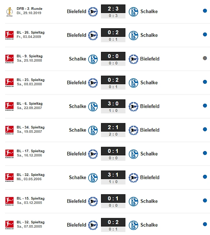 «Шальке 04» непобедим в течение 12 обязательных матчей с «Арминией» (10 побед, две ничьи). Последняя победа «Арминии» над «Шальке 04» датируется 28.09.2002, тогда вестфальцы на домашней арене выиграли в рамках Лиги со счетом 2:1 (Эрхан Албайрак и Мамаду Диабанг забили за «кобальтовых»).