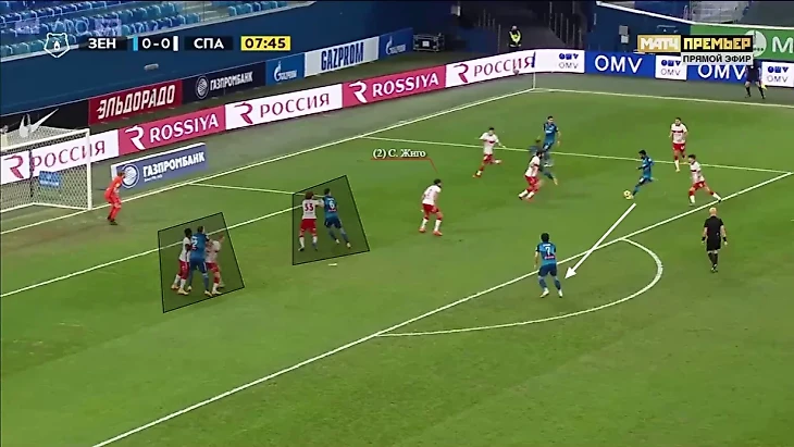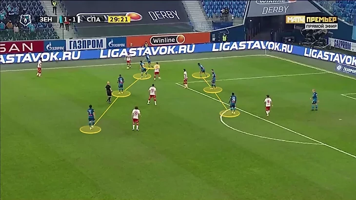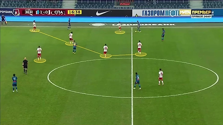 Гости создавали ромбы на флангах и за счет серии коротких передач пытались преодолеть давление. Однако, учитывая то, что в прошлом дерби «Спартаку» удалось сравнять счет после аналогичного взаимодействия, в этом матче «Зенит» перекрыл все подступы. В результате передачи вдоль бровки были чаще всего направлены в никуда.