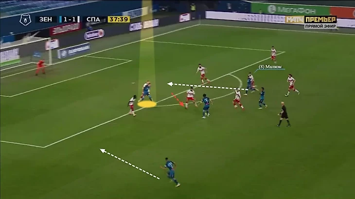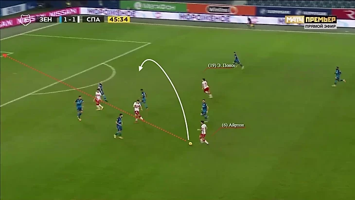 Отличия в позиционных атаках Оба соперника сталкивались с одинаковыми проблемами, когда мяч оказывался на фланге. Но принимаемые решения были противоположными. Хозяева шли по пути наименьшего сопротивления. Если «Зенит» при атаке через фланг упирался в мощное противодействие, у них всегда был вариант паса назад. Они не старались отдать передачу вдоль бровки, как это регулярно совершали футболисты «Спартака». Петербуржцы меняли фланг, в результате чего Ракицкий получал чуть больше свободы и совершал свои вертикальные передачи. Варианты продвижения мяча перекрыты, «Зенит» развернет атаку: