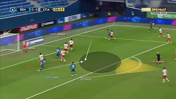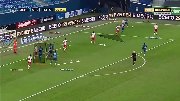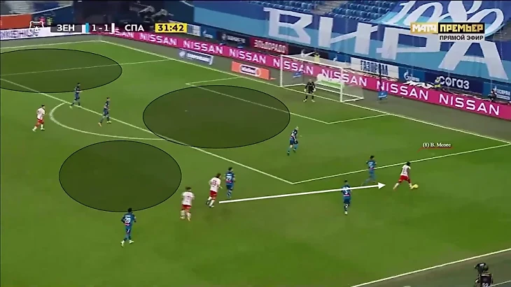 Но будем честны и откровенны, переходные фазы «Спартака» действительно хороши. Им удается переключаться и быстро разворачивать атаку. Однако это тоже стало довольно предсказуемой тактикой. А конкретно в этом матче ромб «Зенита» нейтрализовал все перспективные выходы. Попытка развить быструю атаку приводит к бесперспективной позиционной. «Зенит» за счет ромба перекрывает все варианты передач в центр поля. Единственный вариант передачи – на Мозеса.