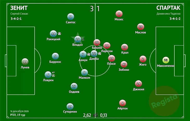 На поле была одна команда, а другая удивила своей беспомощностью, и теперь не только в позиционных атаках, но и в защите. Разберем самые яркие моменты, которые были созданы в результате проблем и ошибок «Спартака», и как заставлял их совершать «Зенит». Больше всего удивляет систематическое повторение одних и тех же эпизодов и отсутствие реакции на происходящие от тренерского штаба москвичей. По сути, «Спартак» не заслуживал свой игрой даже тот единственный забитый мяч, который так изящно грудью забросил Ловрен за спину Луневу, пока в обороне гостей царили полный хаос и непонимание. Состав Вряд ли Тедеско мог выставить какой-либо другой состав, учитывая кадровую ситуацию в команде. Два разноплановых футболиста, которые могу в теории придать разнообразие игре, травмированы. Речь идет о Кокорине и Соболеве. В итоге расположение и стартовый состав был таким же, как и в проигранном матче против «Сочи». Схема от Тедеско – 5-2-1-2. Понятно, что у Семака есть куда более длинная скамейка и возможность для ротации состава, этим мало кто обладает в РПЛ, и это является наибольшим преимуществом. В указанном матче схема «Зенита» на бумаге больше напоминала 4-3-1-2, но на поле можно было видеть четкую структуру в виде ромба. Вершины занимали Барриос и Малком, а по краям располагались Оздоев и Вендел. Рассуждая о схемах, можно предположить что если бы Тедеско выбрал формацию в пользу трех полузащитников, то игра могла бы иметь немного иной характер. Если бы Бакаев регулярно действовал по Венделу в полуфланге, то Крал двигался за Малкомом, а Зобнин – по Оздоеву. Таким образом, в средней линии могло бы возникать численное равенство.