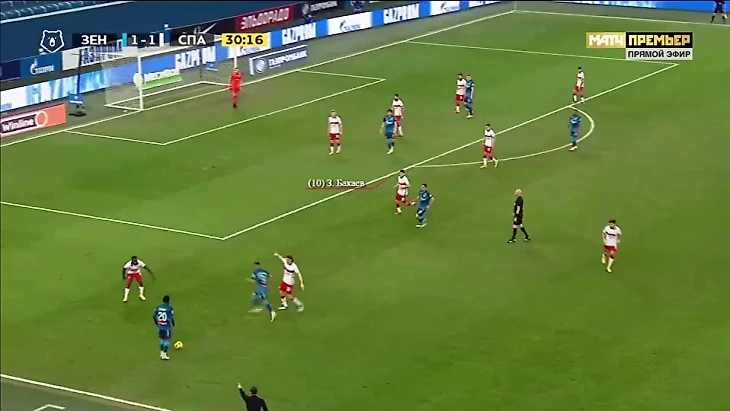 Таким образом хозяева переходили на половину поля соперника большую часть времени за счет длинных передач в сторону Дзюбы, перед этим регулярно двигая мяч с одного фланга на другой, расшатывая оборону соперника и позиции Крала и Зобнина. Также это постоянно вынуждало то выдвигаться латералей гостей по своему флангу, то на рывке возвращаться обратно. Для справедливости отмечу, что во втором тайме «Зениту» удавалось доводить мяч низом до финальной трети за счет смещения Оздоева и Вендела в широкие зоны. «Спартак» же чаще всего мог закрепиться на половине поля соперника за счет перехватов или отбора мяча в средней части поля, после чего быстрая атака упиралась либо в боковую линию, либо в массивное сопротивление футболистов «Зенита».