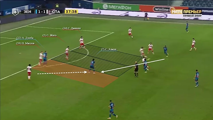 Из-за блокировки Маслов не может встретить соперника. Возникает ситуация, при которой Жиго приходится двигаться только после передачи и по более длинной траектории, по диагонали.