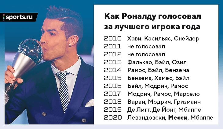 • В 2011-м Роналду не голосовал, потому что капитаном сборной Португалии был Нуну Гомеш (а в голосовании участвуют именно капитаны).