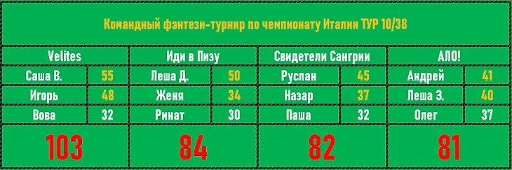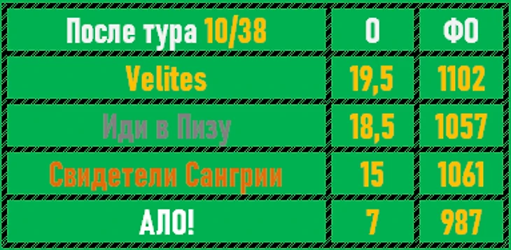 Velites благодаря результату Саши В. отрываются на 1 очко от Иди в Пизу. Три команды разместились друг от друга всего в трех баллах, удача отвернулась от АЛО!