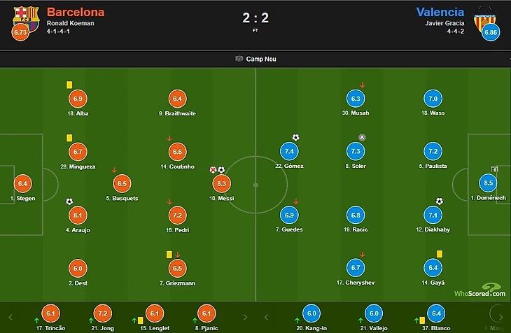 В составе "Барселоны" лучшими ожидаемо были признаны Лионель Месси и Рональд Араухо — игроки, отметившиеся забитыми голами (8,3 и 8,1 балла соответственно).