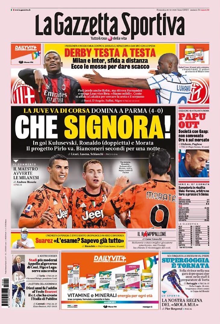 Разгром «Пармы» от «Юве», сегодняшние матчи «Милана» и «Интера», а также встречи «Аталанта»-«Рома» и «Лацио»-«Наполи» – в утреннем обзоре заголовков итальянских спортивных изданий в блоге «В гостях у Кальчо».