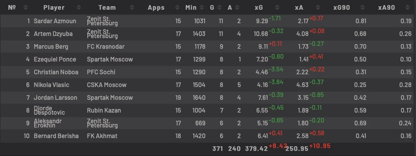 ▪️В бомбардирской гонке с 11 мячами лидируют два перца из «Зенита» (Сердар Азмун и Артем Дзюба), но капитан сборной России забил их обоснованнее. У него 10,68 xG против 9,29 у иранца.