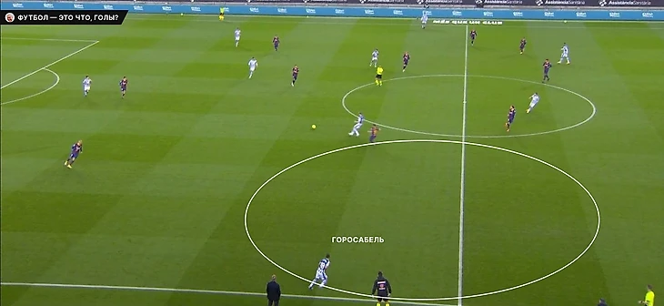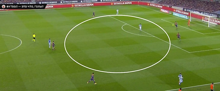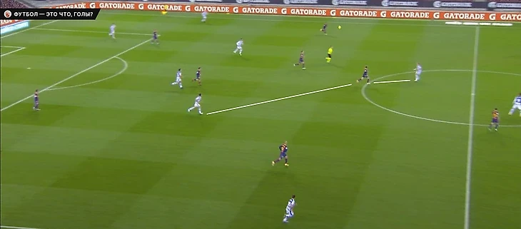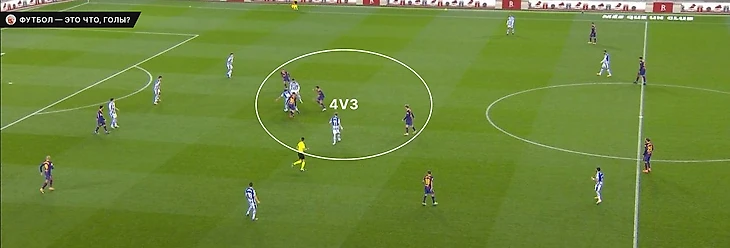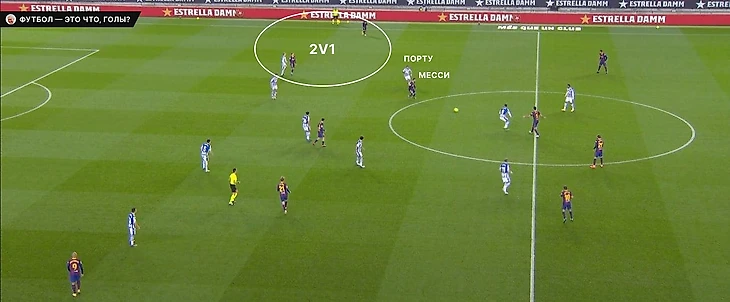 Барселона, чтобы разбивать персональное давление Сосьедада, создавала преимущество 2v1 в зоне опорника Зубименди за счет опусканий Месси.