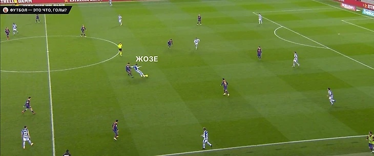 Сосьедад получает возможность для позиционного нападения, но не трансформирует это в моменты. Барселона берет передышку от обороны, владея мячом, и иногда взрывается с помощью Месси. Свою самую опасную атаку Сосьедад смог организовать на 72й минуте, за счет опускания нападающего Жозе. Педри на фланге помогает Десту, чтобы не создавалась ситуация 2v1, за Жозе выдвигается один из Центральных защитников Араухо. Жозе, пользуясь своими габаритами, сохраняет мяч под давлением и переводит на фланг.