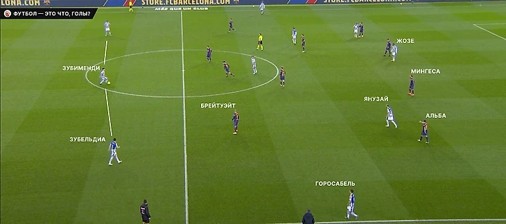 1.Сколько человек будут выдвигаться, когда Сосьедад образовывал тройку сзади с помощью опусканий опорника Зубименди. Барселона выбирала отвечать своей тройкой Брэтуэйт-Месси-Гризманн.