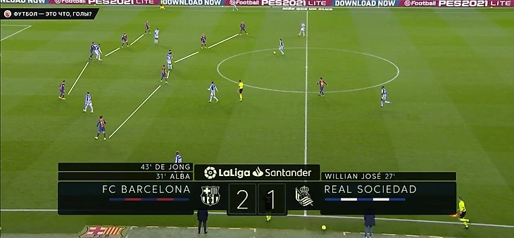 Первые 45 минут полное доминирование Барселоны. За счет опусканий Месси у Барсы всегда есть "свободный" игрок, а Лео - мастер сохранять мяч под давлением, он всегда находит вариант. Запирая гостей в позиционной обороне, Барселона иногда могла создать моменты также в рамках позиционного футбола, за счёт быстрого перемещения игроков. Сосьедад в позиционной атаке ставил некоторые вопросы перед Барсой, но абсолютно не мог этим воспользоваться. При розыгрыше от ворот вся надежда лишь на вратаря Алекса Ремиро, который, да, обладает топовым пасом, но в большинстве случаев лонгболы заканчиваются потерей. Однако, с помощью углового Сосьедад начинает вести в счете 1:0, на 27й минуте. Это был их первый удар в сторону ворот. Но Барселона не позволила аномалии длиться дольше 3х минут. на 30й минуте Сосьедад таки решился пойти на короткий розыгрыш от своих ворот, нарвался на прессинг, в котором все варианты были перекрыты - счет 1:1.