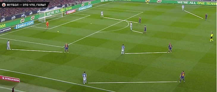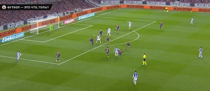 Схема Барселоны (4-2-1-3) и схема Реала Сосьедада (4-1-2-3) изначально предполагает множество персональных дуэлей из-за их зеркальности. Это и отражается на первых минутах, когда обе команды принялись встречать высоко.