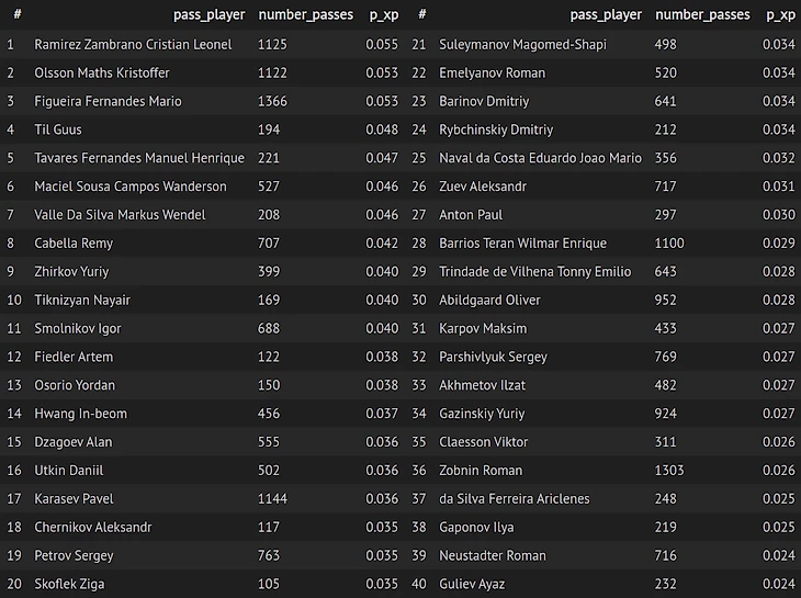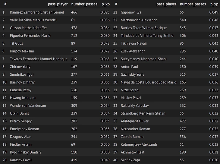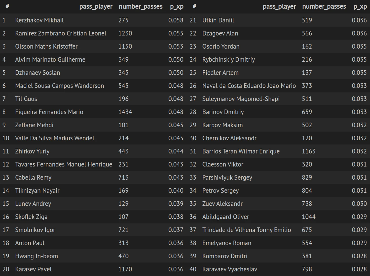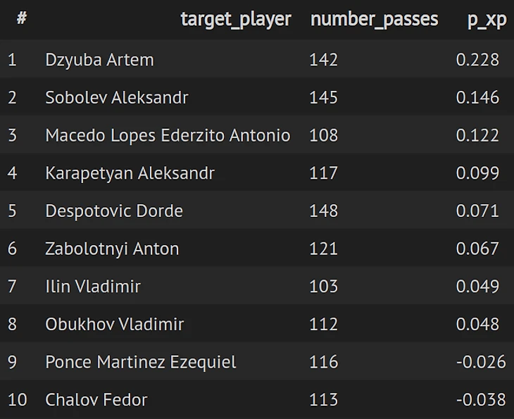 На основе P-xP построим рейтинг игроков РПЛ. Оставим игроков, которые имеют хотя бы 100 передач. Получили следующие результаты.