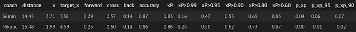 На основе xP и других метрик можно составить профиль передач игрока. В качестве объекта исследования я решил выбрать Гжегожа Крыховяка. Давайте сравним Гжегожа с ним самим, но при разных тренерах. На мой взгляд, Крыховяк при Семине был одним из лучших в РПЛ, а при Николиче сам на себя не похож. Давайте посмотрим, как поменялись его передачи после смены тренера.