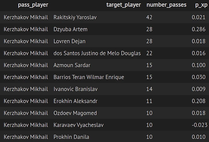 Как видим, основной вклад в высокий P-xP Михаила Кержакова внес Артем Дзюба. Для Гильерме таким игроком выступил Эдер с 15-ю передачами с P-xP равным 0.358. Сослану Джанаеву помог Антон Заболотный: 32 передачи с 0.279 P-xP. Все три игрока хорошо играют на втором этаже, что повышает вероятность, что длинная передача окажется успешной.