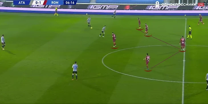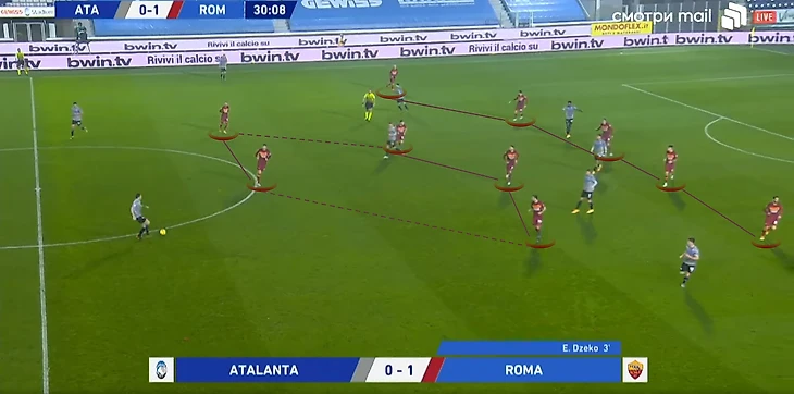 Из этой формации римляне переходили на ситуативную расстановку 5-3-2 за счёт выдвижений Педро или Мхитаряна, в зависимости от того, через какой фланг «Аталанта» пытается развить атаку: