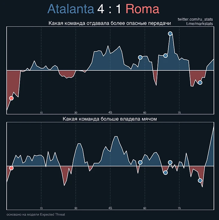 «Рома» провела близкий к отличному первый тайм: здорово в рамках своей структуры оборонялась, хотя в конце тайма «Аталанта» получила больше контроля, чем обычно (хорошо видно на графике xT — он будет ниже). Однако бергамаски не смогли конвертировать это в моменты. Римляне же провели в атаке ощутимо меньше времени, чем соперник, однако выжали намного больше остроты, вполне могли забивать ещё раз.