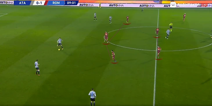 По «Роме» несколько иначе: Сапата — в самой высокой позиции, Пессина и Малиновский — узко и чуть глубже, «Аталанта» выбрала расстановку 3-4-2-1, так бергамаски прессингуют команды, которые отдают явное предпочтение схеме с тройкой защитников.