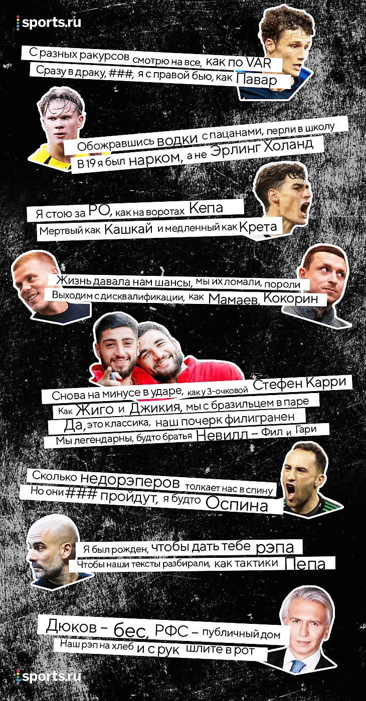 – Поехали про альбом. «С разных ракурсов смотрю на все, как по ВАР. Сразу в драку, ###, я с правой бью, как Павар» – это моя любимая футбольная рифма альбома. Какая твоя?