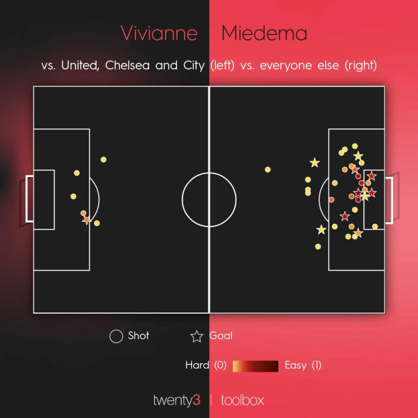 Вивианн Мидема в текущем сезоне против «Ман Юнайтед», «Челси», «Ман Сити» (слева) и всех остальных (справа)