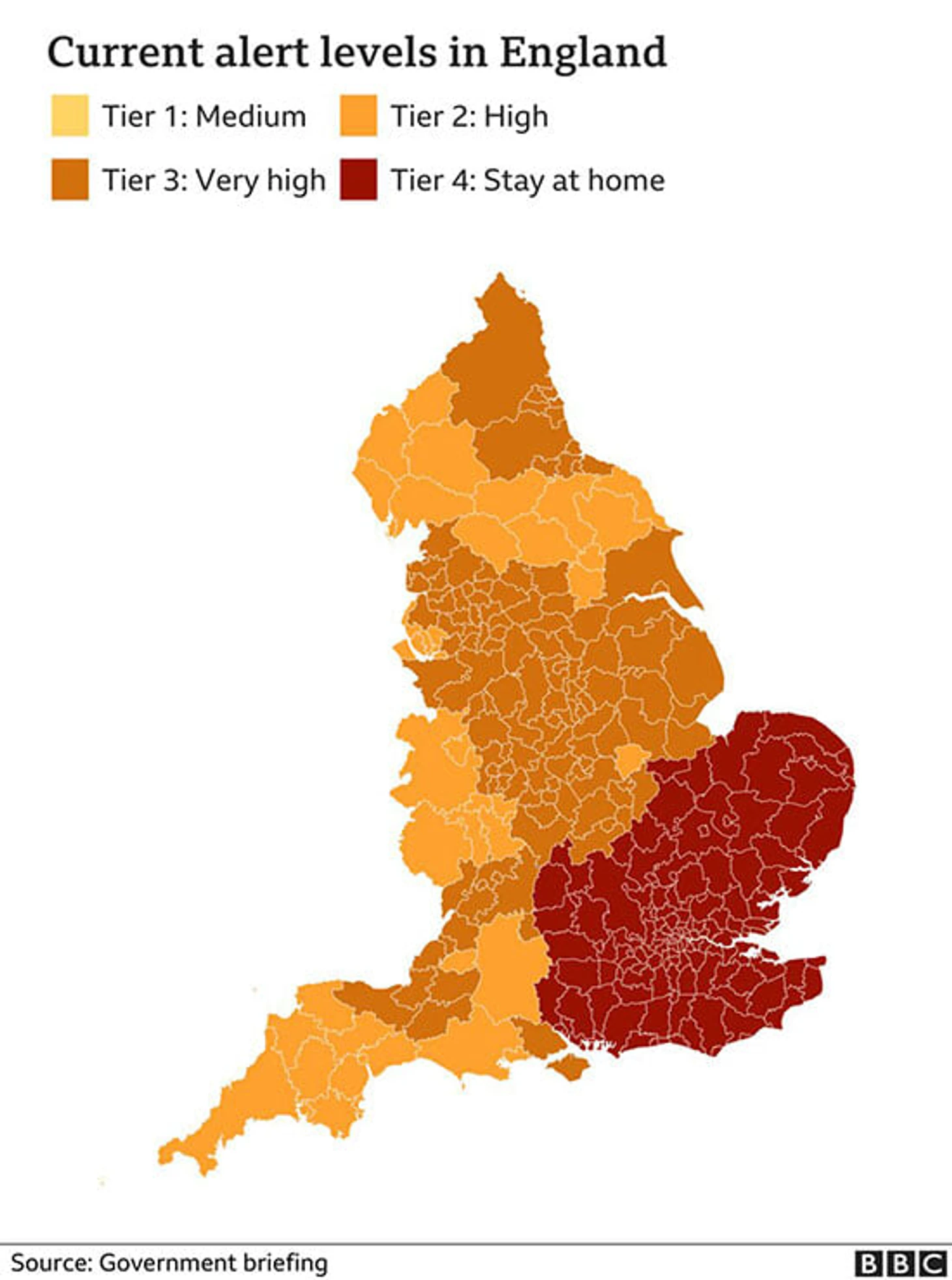 Перемещения между уровнями де-юре запрещены: по факту же неделю назад, когда обновленные правила должны были вступить в силу с полуночи, вокзалы Лондона превратились в кадры из фильмов-апокалипсисов. Рискующие остаться на праздники в одиночестве лондонцы из регионов ринулись домой (очевидно, развозя ковид по стране).