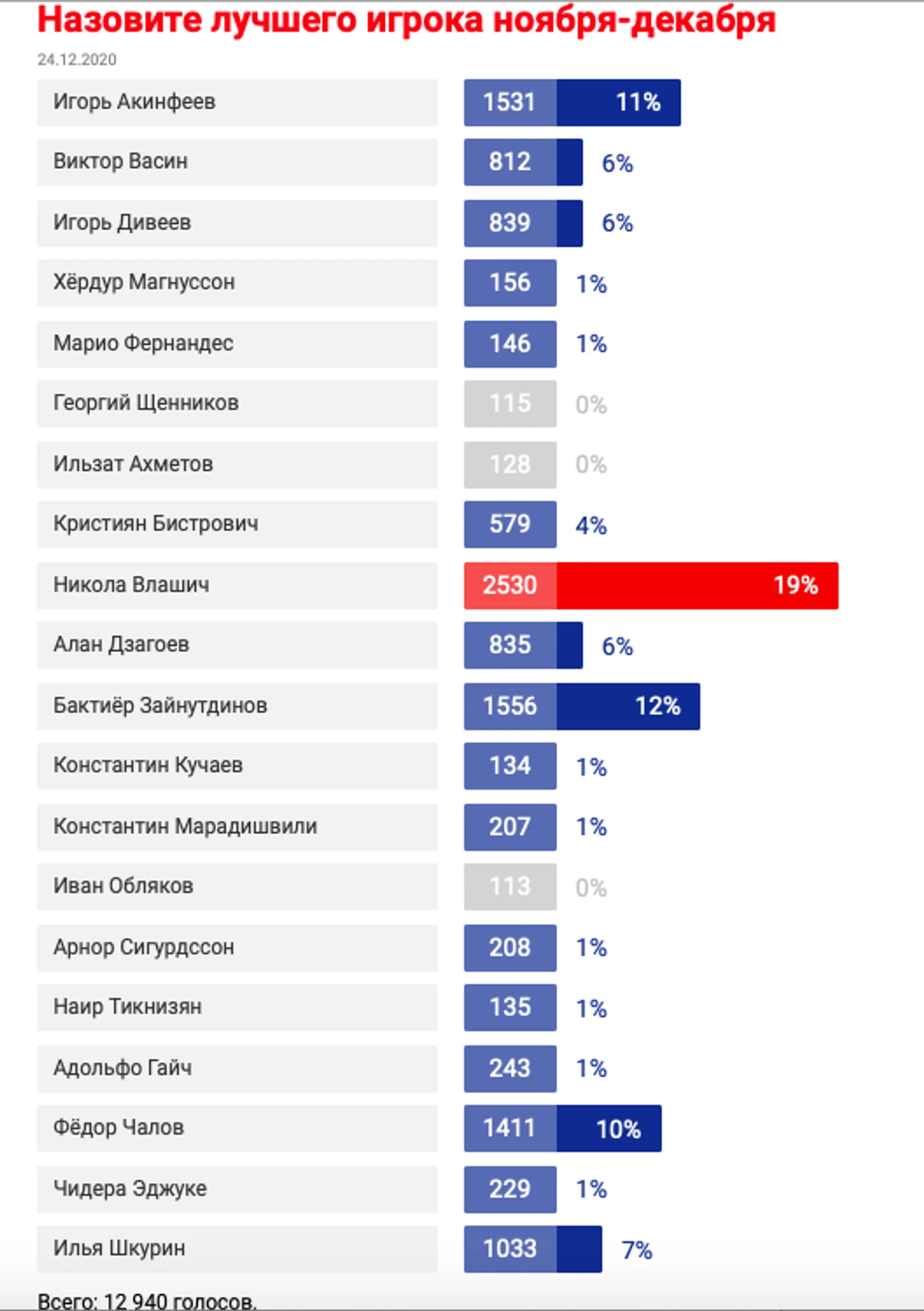 • В итоге ЦСКА назвал Влашича лучшим игроком ноября-декабря, но дал Васину «приз зрительских симпатий», сопроводив все такой ремаркой: «По ходу голосования путем накрутки были достигнуты аномальные показатели у нескольких игроков. После завершения опроса все накрученные голоса были удалены. Тем не менее мы решили присудить Виктору Васину приз зрительских симпатий».