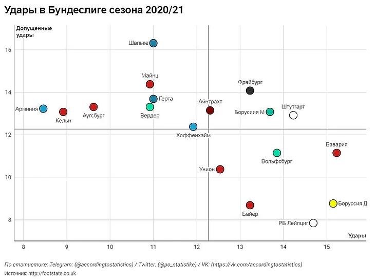 Арминия, Аугсбург и Кёльн являются наименее бьющими командами лиги, а Шальке с таким показателем допущенных ударов (16,31) может уже паковать чемоданы во вторую лигу (хотя шансов спастись ещё предостаточно).