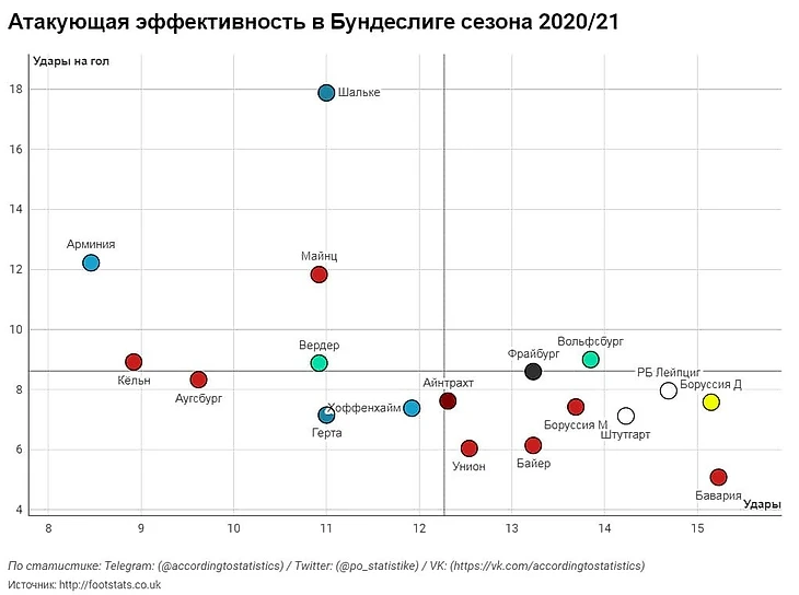 В данном графике указаны количество наносимых клубами ударов (в среднем за матч) и среднее количество ударов на один забитый мяч.