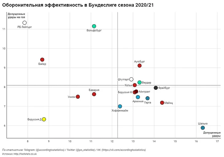 РБ Лейпциг - безоговорочный лидер по совокупности данных показателей: допускают лишь 7,85 ударов за матч, а пропускают лишь с каждых 11,33 ударов.