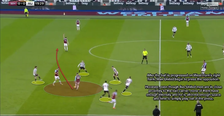 В приведенном ниже примере мы видим, как один игрок, не прессингующий достаточно быстро, может быть наказан. Улучшение в этой области мгновенно затруднило бы провдижение соперников, если бы Юнайтед умело прессинговал