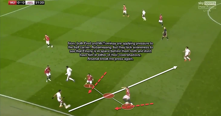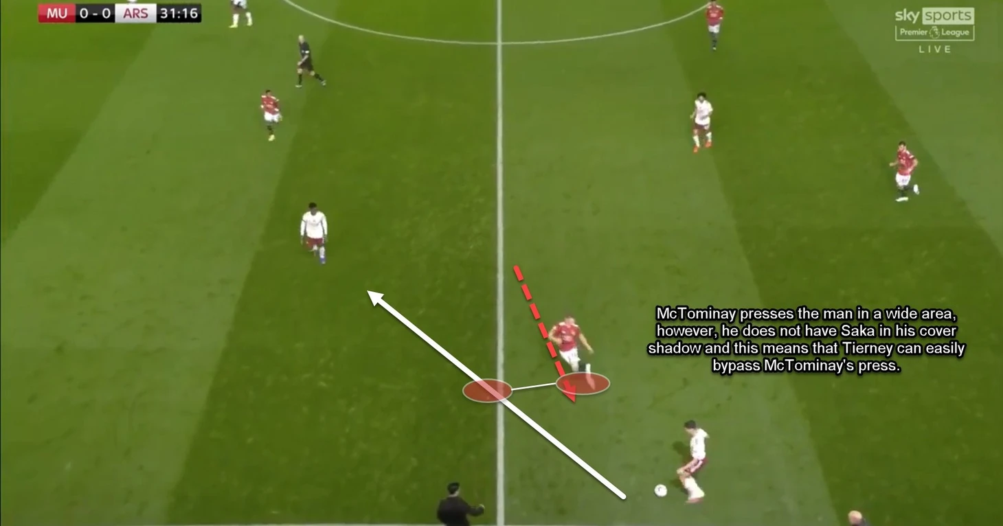 Скотт пресингует фулбека в широкой позиции, но он не перекрывает линию передачи на Сака, в итоге простой пас 3. Отсутствие командного прессинг. Это может быть самым важным фактором, почему «Юнайтед» не добивается успеха в прессинге. Было много случаев, когда у «Юнайтед» был разбитый изначально прессинг, и соперники могли этим воспользоваться.