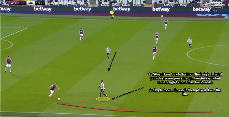 Вест Хэм начинает атаку справа. Марсиаль просто обозначает давление, но не такое, что бы остановить фулбека от передачи или заставить его отдать пас назад. Итог - простая передача вперёд.