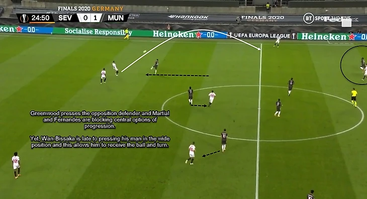 Гринвуд прессингует центральных защитников, когда Марсиаль и Бруно перекрывают центр. Итог, Биссака не успевает, в итоге соперник в широкой позиции получает мяч и успевает даже развернуться с ним