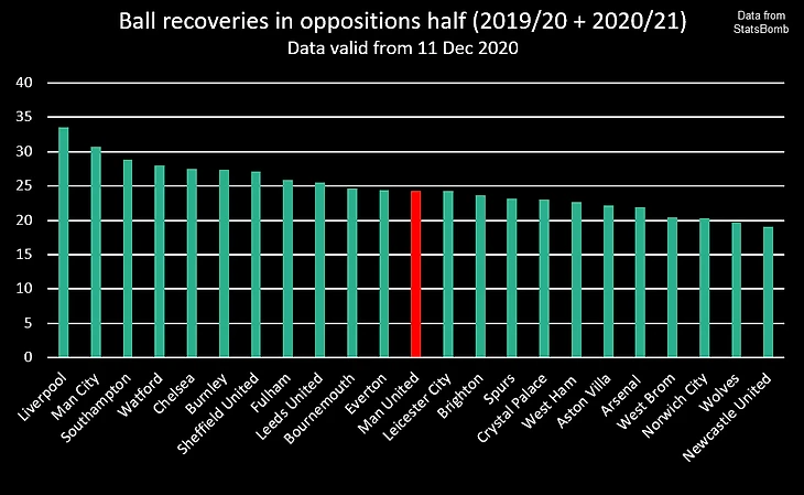 В сезоне 2018/19 «Манчестер Юнайтед» в среднем набирал всего 22,63 возврата владение мяча в половине соперников за 90 мин - это был 16-й худший показатель в Премьер-лиге за сезон. (StatsBomb)