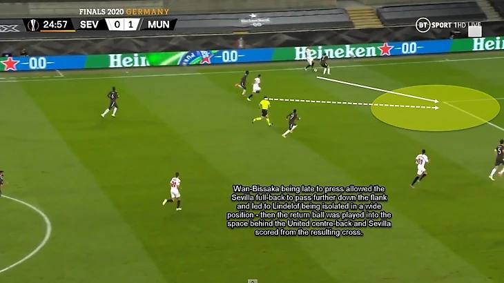 Биссака не успевает в прессинг, в итоге фулбек передаёт мяч вперёд по флангу, и Линделеф в итоге оказывается изолирован в широкой позиции. Мяч возвращают фулбеку в пустое пространство, и Севилья забивает гол.