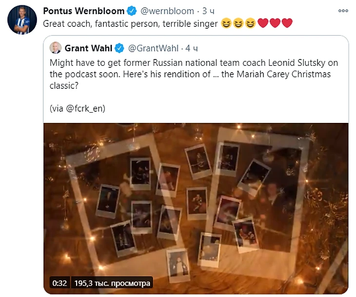 Новостной редактор The Athletic (одного из главных спортивных изданий мира) Питер Бакингем тоже восхищается: «Бывший тренер сборной России и «Халла» Леонид Слуцкий поет «All I Want For Christmas». И это просто великолепно. Какой же он крутой».