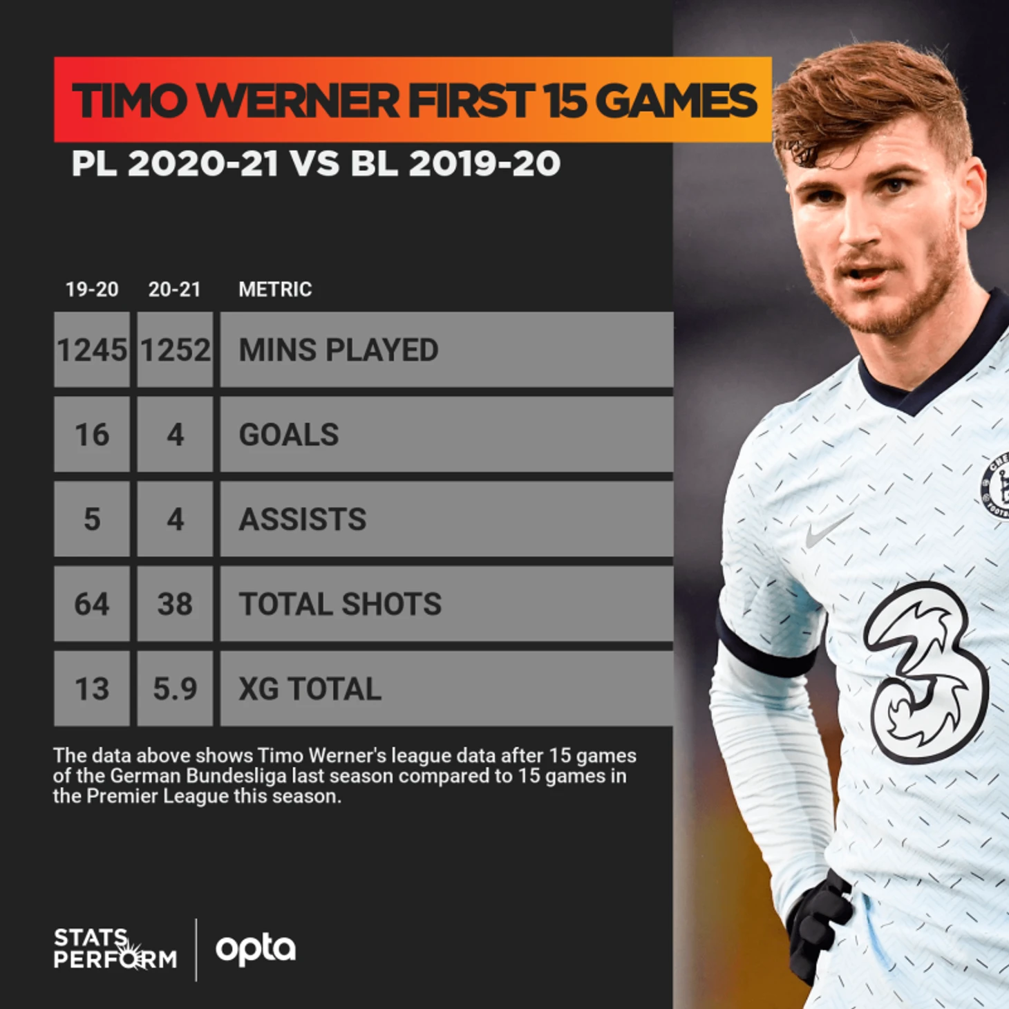 В прошлом сезоне Вернер в Бундеслиге совершал 3,78 удара по воротам за 90 минут игры. В текущем сезоне, у него в среднем 2,26 удара во всех соревнованиях, а впереди него по среднему количеству ударов в матче идут такие игроки как Тэмми Абрахам, у которого 3,12 удара, а также Хаким Зиеш, Кристиан Пулишич и Оливье Жиру, результат которых еще лучше. Вернера вытолкнули на фланг и дали роль, в которой его значимость снизилась, а значит, снизился и вклад, который он мог бы внести в команду.