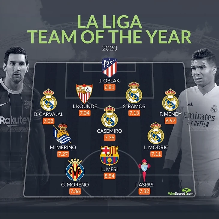 Статистический портал WhoScored составил символическую сборную Ла Лиги за календарный 2020 год. В нее вошел голкипер мадридского Атлетико Ян Облак. Средняя оценка словенца за год составила 6.81. Это лучший показатель среди вратарей