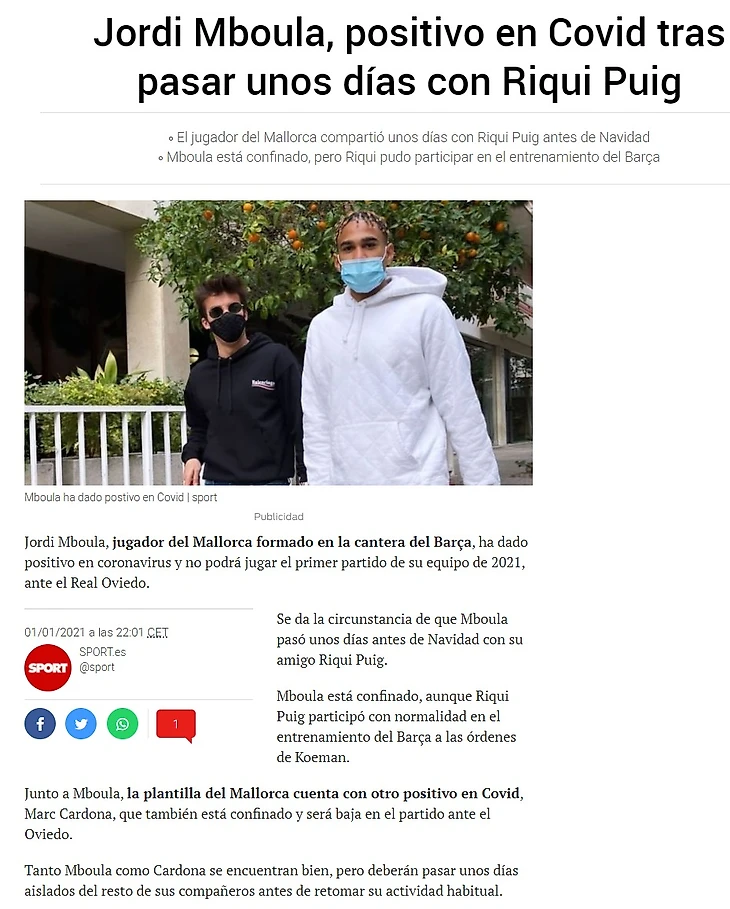 Ночью на Sport вышел материал без подписи автора, повествующий о карантине для Жорди Мбоулы, который из-за этого не сможет сыграть в первом матче «Мальорки» в 2021-ом году. В материале акцентируют внимание на том, что Жорди проведал в Барселоне своего старого друга Рики Пуча, и при этом Рики свободно тренируется в «Барсе». Сам Мбоула отреагировал на это твитом со своими объяснениями бессмысленности этих обвинений. Позже публикация на Sport была дополнена словами Жорди.