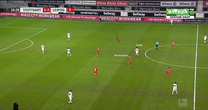 У Штутгарта, в свою очередь, при розыгрышах был следующий паттерн: либо это 4+2 с опорниками, либо 3+2 с образованием тройки с помощью опусканий крайнего защитника Стензела, а за ширину отвечали Вамангитука и Соса. Цель в обоих формациях была одна - найти передачей опорника Эндо для последующего перехода в атаку. Но Лейпциг подготовился к этому: в первом случае, когда Стензел оставался шире, гости отдавали ему свободу и перекрывали Эндо. Во втором - Эндо также был кем-то прикрыт + Анхелиньо в любой момент мог выдвинуться на Стензеля, закрывая тенью Эндо, а для подстраховки мог сместиться и Ольмо. Анхелиньо двигался за Эндо практически персонально, передавая его только в тот момент, когда Эндо уходил слишком далеко из зоны ответственности Анхелиньо. Здесь, на скрине, мы видим как Анхелиньо показывает рукой взять Эндо под опеку:
