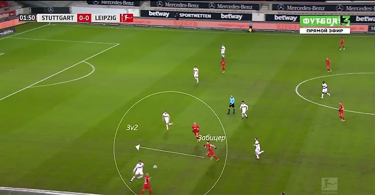 Лейпциг прямо со старта начал проверять правый фланг обороны Штутгарта. Во-первых, там играет один из лучших крайков Европы - Анхелиньо. А во-вторых, возможно уже на предматчевом анализе тренерский штаб "Лейпцига" определил эту зону самой уязвимой у хозяев. Анхелиньо держит ширину, притягивая к себе крайнего защитника Стензела, Забицер в высокой позиции ищет момент для рывка в "карман" между правым и правым-центральным защитниками, ситуация 3v2: