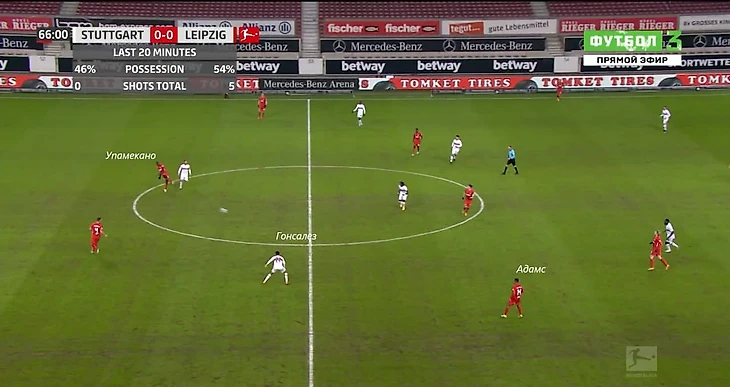 Лейпциг также мастерски выманивал Штутгарт в прессинг, когда те выстраивались для позиционной обороны. А выманив, проходили его в несколько передач и получали атаку на пространстве (как на скрине ниже). Например, тут Гонсалез выдернулся на Орбана, Адамс открылся, а Упамекано своевременно и качественно пасует на него (после этого будет забит единственный гол):
