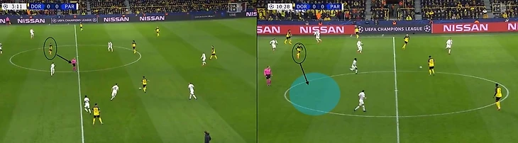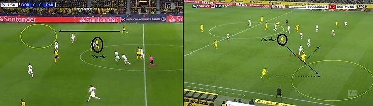 Когда Санчо играет справа, он подобного Гринвуду, также редко ( бывает, но всё же редко ) когда держит ширину. Он также как и Гринвуд опускается к центру поля и ищет мяч, а его место занимает Хакими ( фулбек, который в итоге и был одним из самых результативных игроков команды )