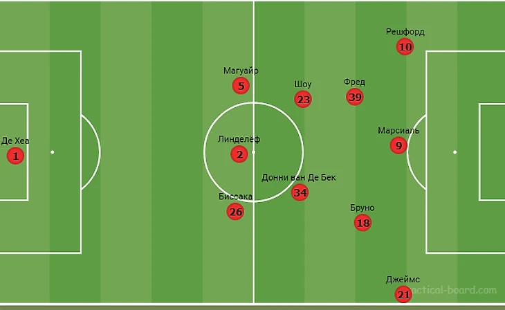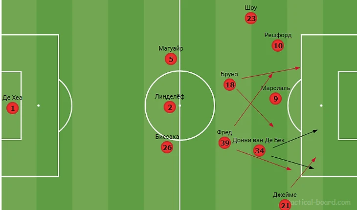 Пока вы не начали смеяться с Джеймса, надо пояснить. Да, игрок очень низкого качества, но он чуть ли не единственный сейчас, кто сможет держать ширину, будь то справа, будь то слева. При этом, МЮ будет иметь тройки сзади, а за креатив поля отвечают Фред и Бруно. Игроки не лучшие в игре один в один, но быстрые, а главное, за ними будет тройка центральных защитников. При этом, занимая более глубокую позицию, они смогут управлять темпом игры. ( Фреда можно заменить и на Погба, для более лучшего качества ). В такой системе и используются лучшие качества игроков: Решфорд- смещение в центр и удар/рывок Бруно и Фред/Погба - креатив, видение всего поля. Донни Ван Де Бек - поиск и создания пространства, делает разницу, даже когда этого не замечаешь. Джеймс - может использовать свою взрывную скорость для рывка в штрафную для последующего прострела. При этом, Ван Биссака даёт надежность сзади, что своего рода тоже использование лучших его качеств.