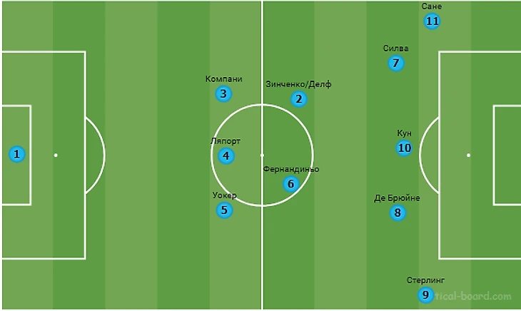 Такое расположение игроков позволяет использовать лучшие качества этих футболистов. Сане и Стерлинг всегда держат линию, имеют хороший дриблинг и взрывной рывок, дабы пробежать по флангу и сделать прострел. Восьмерки - Де Брюйне и Сильва играют между линиями. Они имеют прекрасный пас и чувство пространства, и всегда знают, что и когда они должны сделать в тот или иной момент. Сильва часто отдавал пасы на рывки Сане, который делал прострел в штрафную или бил по воротам. Тоже касается и КДБ, только тот ещё и сам мог сделать навес. При этом, они имеют тройку сзади, что бы было проще выходить из под прессинга двух нападающих и иметь подстраховку. За центр отвечают Фернандиньо и Зинченко/Делф, которые имеют отличный пас, и могут поддерживать один из флангов, если там находится мяч. Сбалансированная атака, сбалансированная оборона.